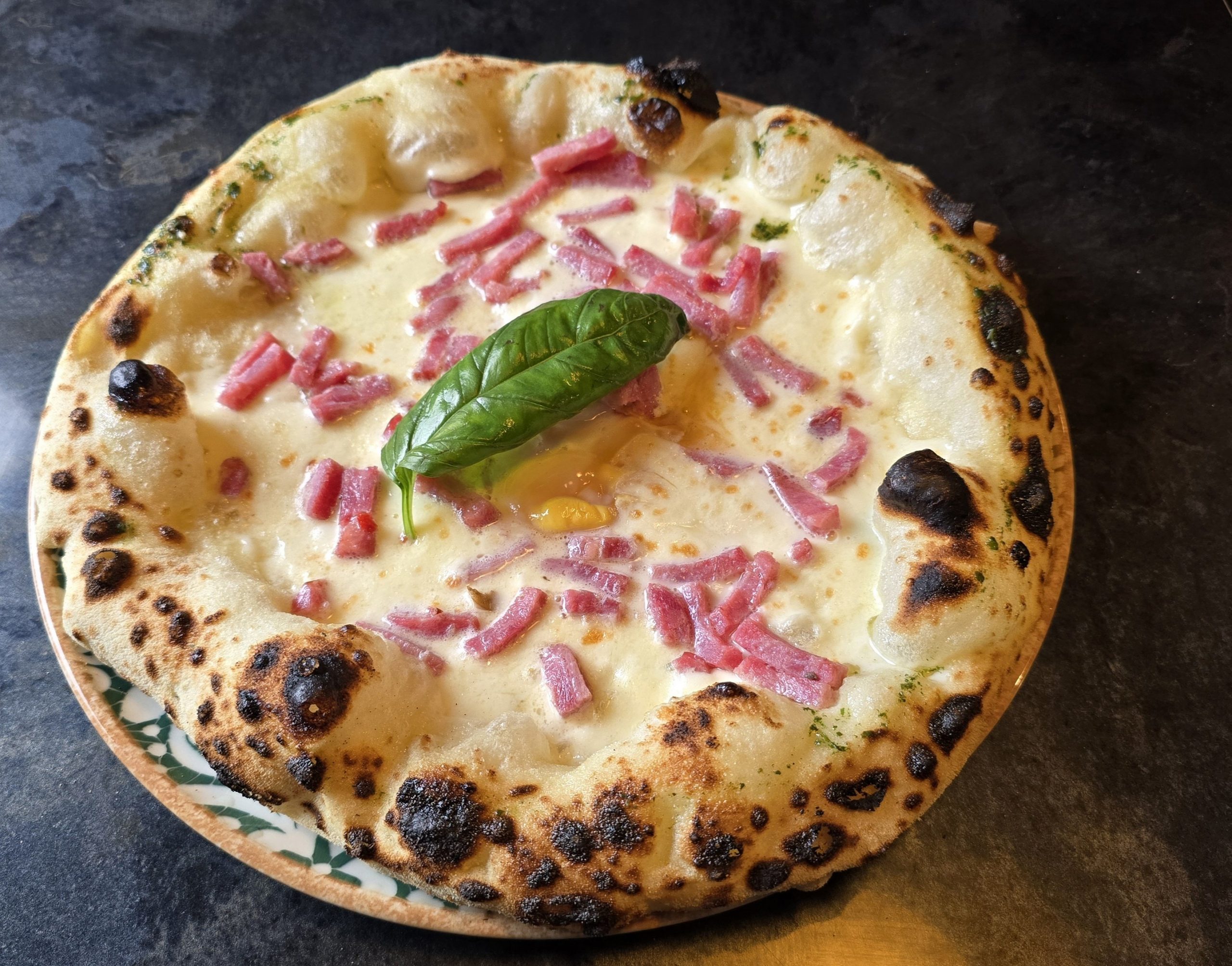 Crème fraîche légère ,fior di latte,lardons,oeuf.